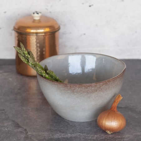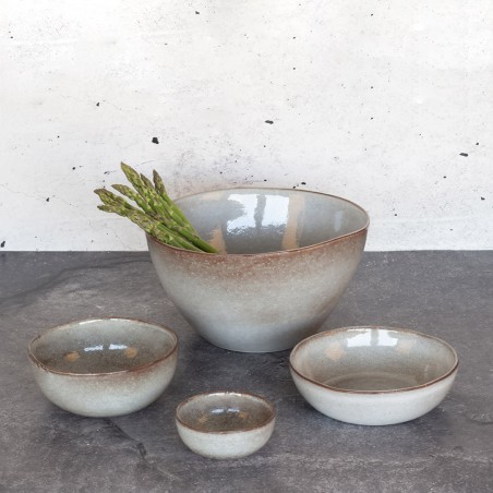 Organiczna Niska miska w stylu boho o średnicy 18 cm, wykonana z kamionki, wytrzymałej ceramiki idealnej do codziennego użytku. Reaktywne szkliwo z efektem cieniowania kolorów sprawia, że każdy kawałek jest wyjątkowy. Lokalna produkcja w Portugalii.
